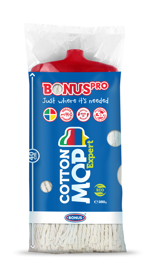 A felmosófej textil része 50% pamut, 50% poliészter és viszkóz keverék, mely jelentős nedvszívó képességet biztosít. A kényelmes felhasználás érdekében a terméket kettő az egyben, olasz és német menetes fejjel láttuk el, így szinte minden nyéllel kompatibilis. A nagy hatékonyságot biztosító széles felmosófej miatt a hagyományos felmosók csavarókosarában nem lehet alaposan kicsavarni, így javasolt a 18l-es vödörrel, illetve a moppréssel történő felhasználás. A BONUSPRO CottonMOP Expert rendkívül alapos tisztaságot biztosít minden professzionális környezetben.