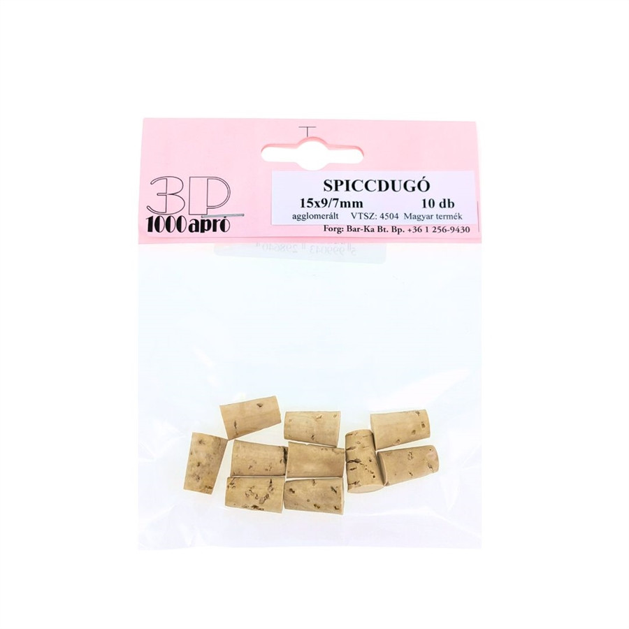 A 15x9/7 mm spiccdugó kisebb méretű díszüvegek, kóstoltató üvegek, díszüvegek, vagy akár kémcsövek lezárására alkalmas. Tökéletes, valamint rapid palackzárást biztosít.
